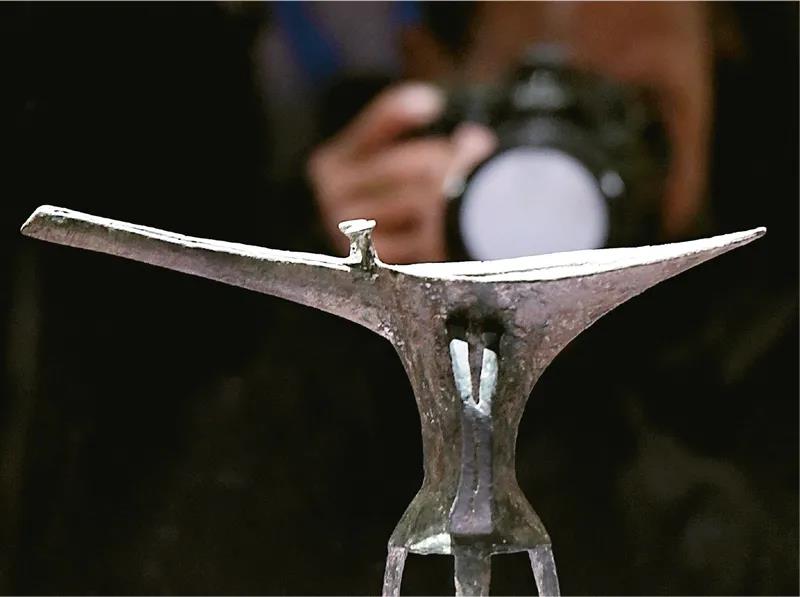 ▲二里头遗址位于河南省洛阳市偃师二里头村,距今约3800—3500年。历经几代人的不懈探索,目前二里头遗址发现了中国最早的“紫禁城”、最早的城市主干道网、最早的青铜礼器群及铸铜作坊、最早的双轮车辙……成为寻找夏代最重要的一把钥匙。图为2019年10月19日,参观者在二里头夏都遗址博物馆内拍摄展品“乳钉纹铜爵”。新华社记者 李安/摄