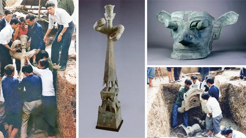 ▲位于四川广汉的三星堆遗址发现于1927年,遗址所处年代相当于夏代晚期至商周之际。1986年,在遗址祭祀区发掘两座祭祀坑,出土金杖、面罩、铜神坛、神树、人像、面具、玉石礼器、象牙雕饰等珍贵文物1720件,揭开了早期古蜀文明的神秘面纱。2020年,三星堆遗址考古新发现五座商代晚期祭祀坑,对进一步揭示古蜀文明的文化面貌与重要价值,不断深化对多元一体中华文明形成历史进程的认识具有重要意义。图为1986年三星堆遗址一、二号祭祀坑发掘现场,以及出土的铜大立人像和铜纵目面具。四川省文物考古研究院供图