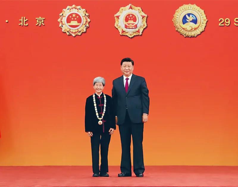 ▲2019年9月29日,中华人民共和国国家勋章和国家荣誉称号颁授仪式在北京人民大会堂金色大厅隆重举行。中共中央总书记、国家主席、中央军委主席习近平向“文物保护杰出贡献者”国家荣誉称号获得者樊锦诗颁授奖章。新华社记者 王晔/摄